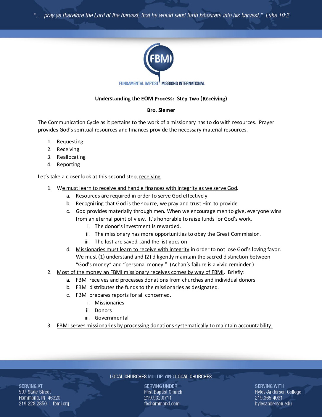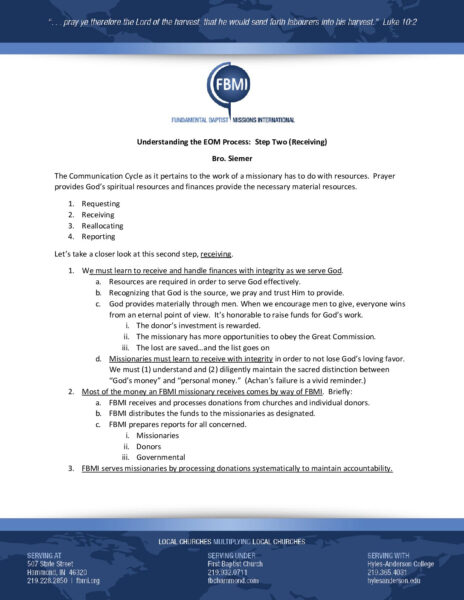 Fundamental Baptist Missions International is a local-church missions agency that trains, supports, finances, and develops missionaries and ministries which preach the Gospel of Jesus Christ, disciple believers, and multiply churches. It is our vision to see Gospel-preaching churches actively multiplying in every nation.