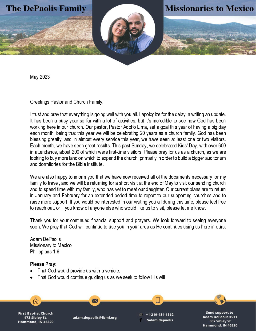 View Larger Image Adam DePaolis May 2023 Prayer Letter – Revised Proofreader2023-05-10T09:15:18-05:00May 10th, 2023| Share with others. FacebookXLinkedInEmail