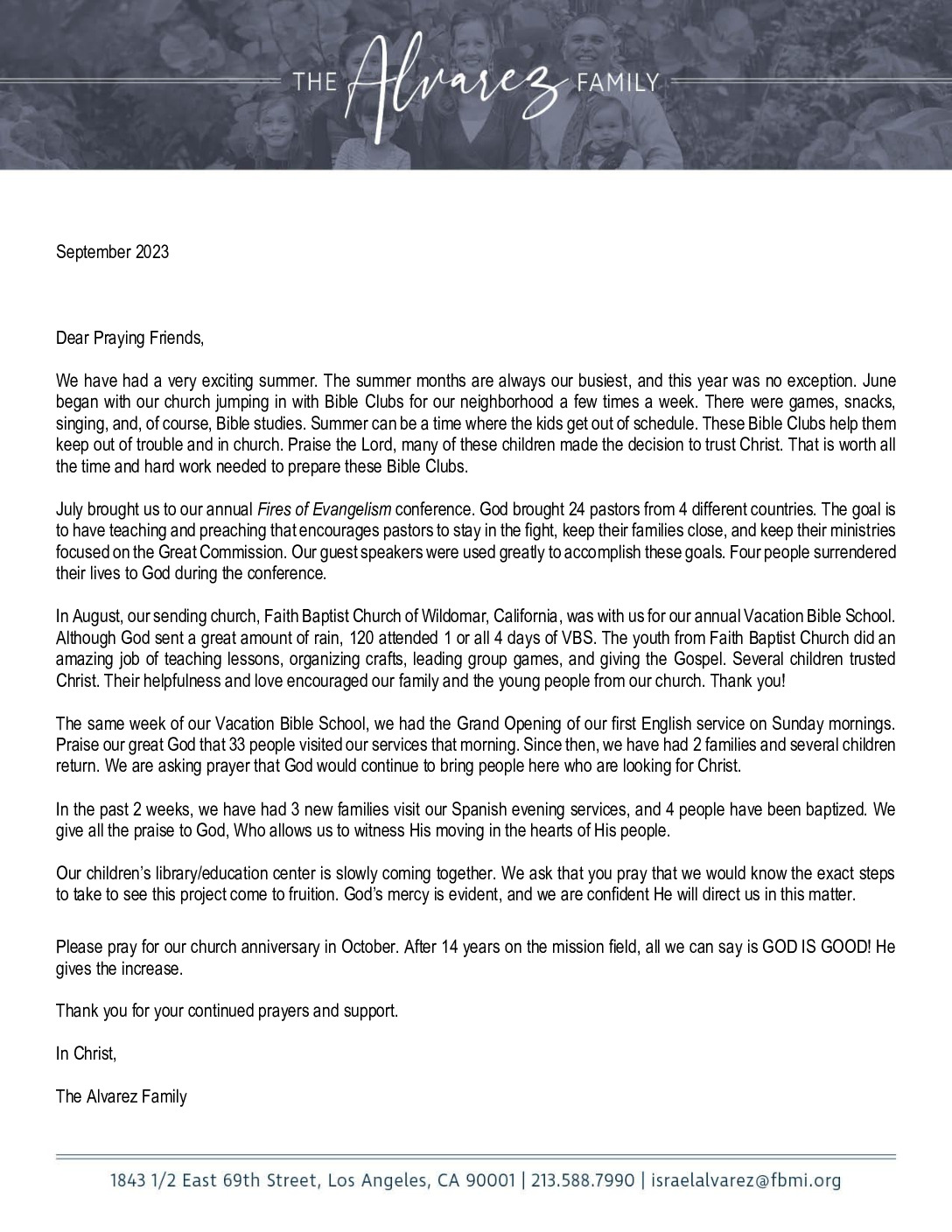 View Larger Image Israel Alvarez September 2023 Prayer Letter – Revised Proofreader2023-09-20T11:16:11-05:00September 20th, 2023| Share with others. FacebookXLinkedInEmail
