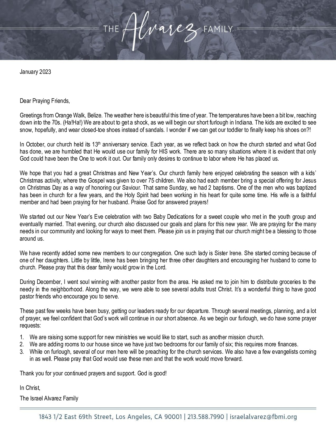 View Larger Image Israel Alvarez January 2023 Prayer Letter Proofreader2023-01-09T13:56:10-06:00January 9th, 2023| Share with others. FacebookXLinkedInEmail