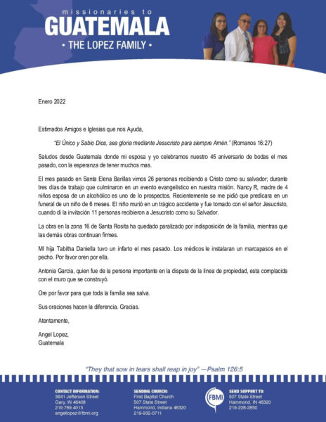 View Larger Image Angel Lopez January 2022 SPANISH Prayer Letter Proofreader2022-01-05T14:42:16-06:00January 5th, 2022| Share with others. FacebookXLinkedInEmail
