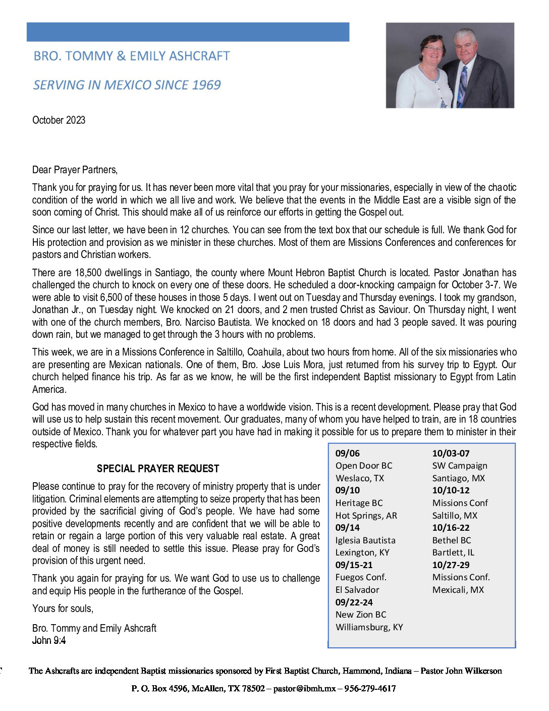 View Larger Image Tommy Ashcraft October 2023 Prayer Letter Proofreader2023-10-17T20:58:02-05:00October 17th, 2023| Share with others. FacebookXLinkedInEmail