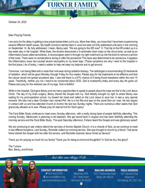 View Larger Image Ben Turner October 2023 Prayer Letter Proofreader2023-10-24T17:38:40-05:00October 24th, 2023| Share with others. FacebookXLinkedInEmail