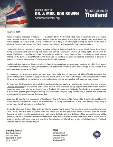 View Larger Image Bob Bowen November 2014 Prayer Letter Proofreader2015-01-23T21:02:34-06:00January 23rd, 2015| Share with others. FacebookXLinkedInEmail