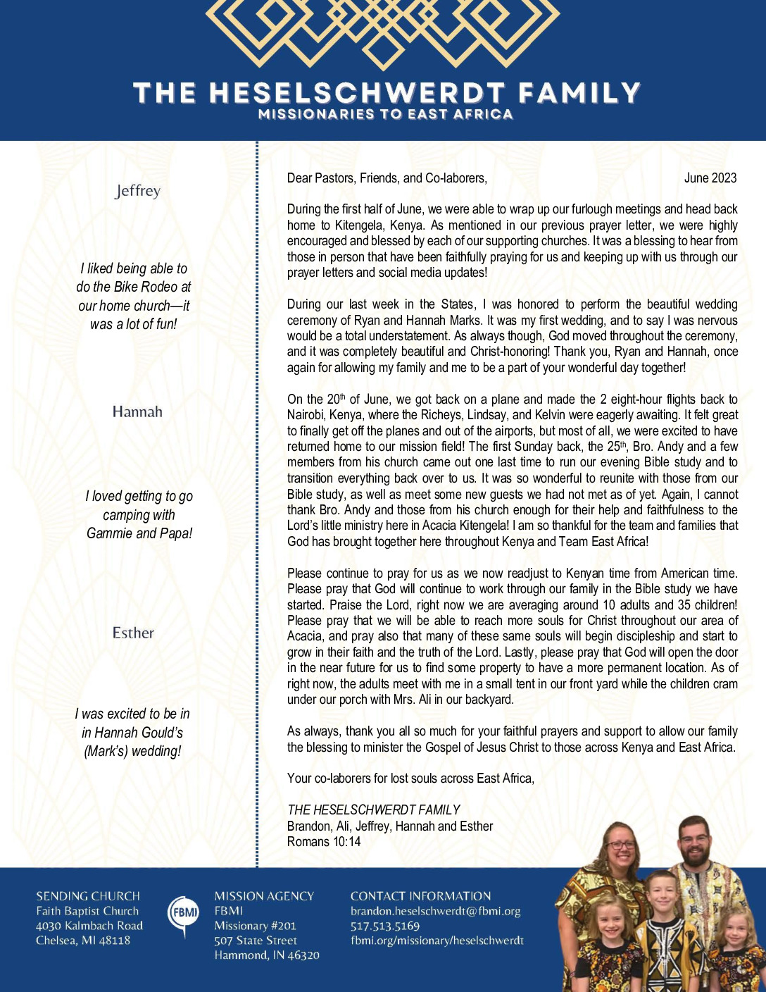 View Larger Image Brandon Heselschwerdt June 2023 Prayer Letter Proofreader2023-07-18T19:56:11-05:00July 18th, 2023| Share with others. FacebookXLinkedInEmail
