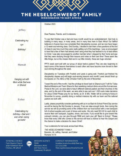View Larger Image Brandon Heselschwerdt October 2023 Prayer Letter Proofreader2023-11-11T15:05:38-06:00November 11th, 2023| Share with others. FacebookXLinkedInEmail