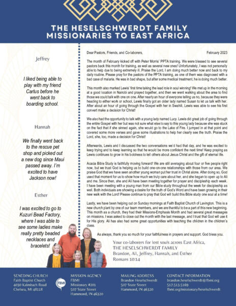 • View Larger Image thumbnail of Brandon Heselschwerdt February 2023 Prayer Letter