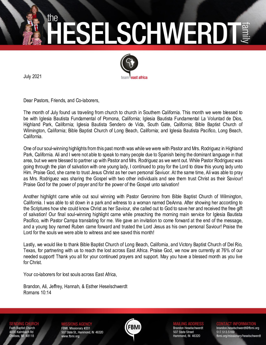 Brandon Heselschwerdt July 2021 Prayer Letter