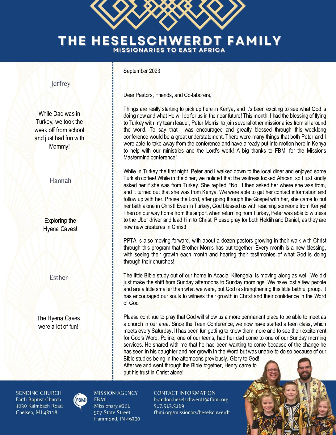 View Larger Image Brandon Heselschwerdt September 2023 Prayer Letter Proofreader2023-11-11T10:34:23-06:00November 11th, 2023| Share with others. FacebookXLinkedInEmail