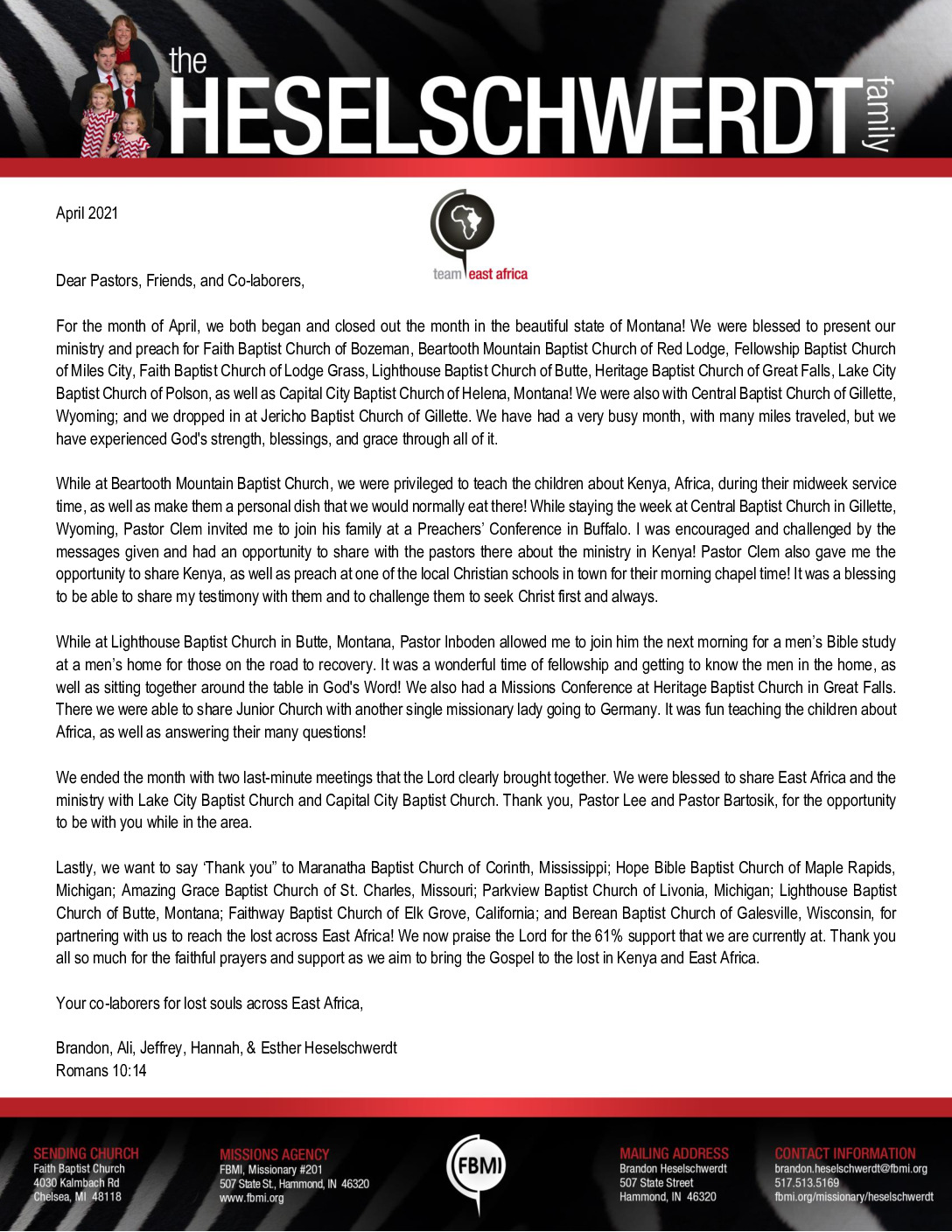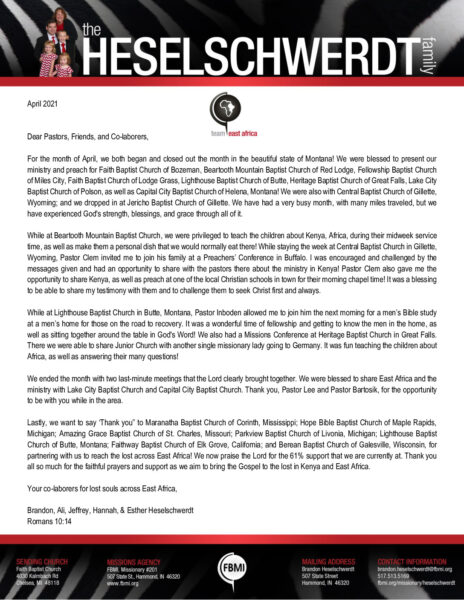 View Larger Image Brandon Heselschwerdt April 2021 Prayer Letter – Revised Proofreader2021-05-13T14:21:18-05:00May 13th, 2021| Share with others. FacebookXLinkedInEmail