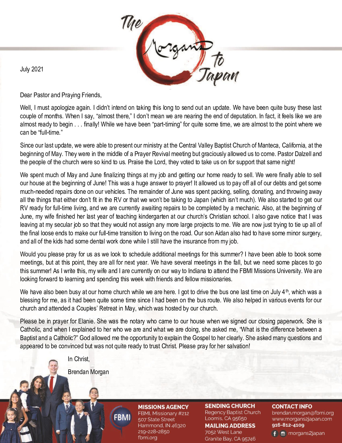 View Larger Image Brendan Morgan July 2021 Prayer Letter Proofreader2021-07-10T20:57:37-05:00July 10th, 2021| Share with others. FacebookXLinkedInEmail