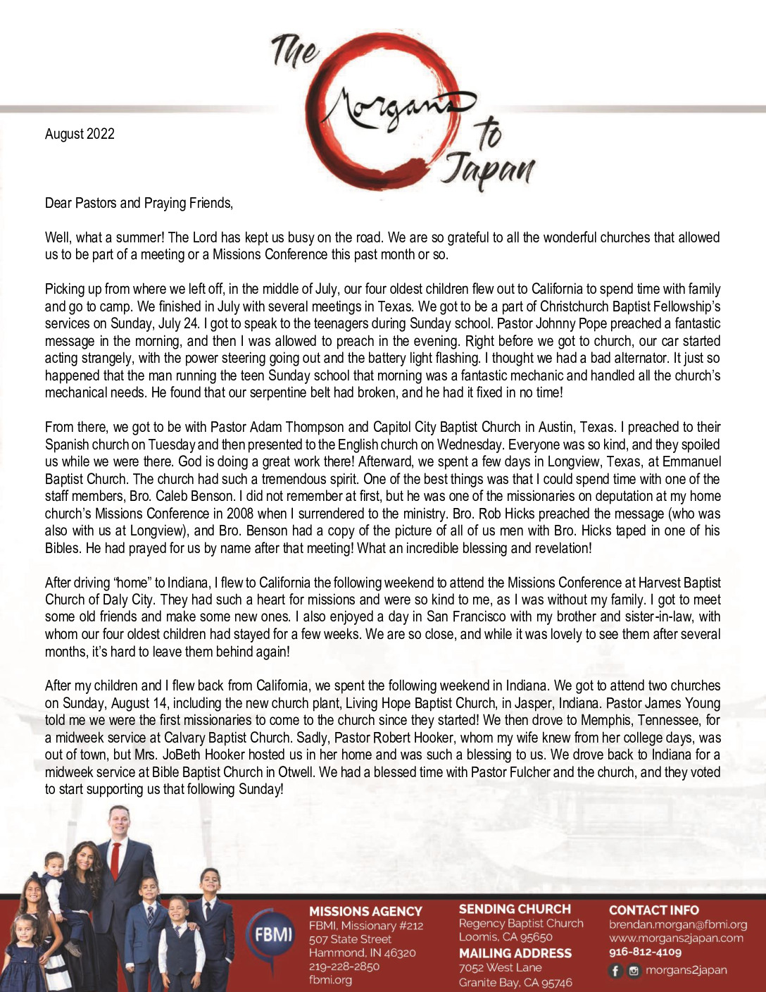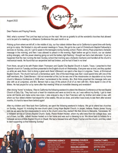 View Larger Image Brendan Morgan August 2022 Prayer Letter Proofreader2022-09-06T21:03:25-05:00September 6th, 2022| Share with others. FacebookXLinkedInEmail