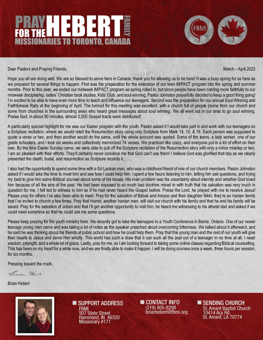 View Larger Image Brian Hebert Mar-Apr 2023 Prayer Letter Proofreader2023-05-15T13:15:41-05:00May 15th, 2023| Share with others. FacebookXLinkedInEmail