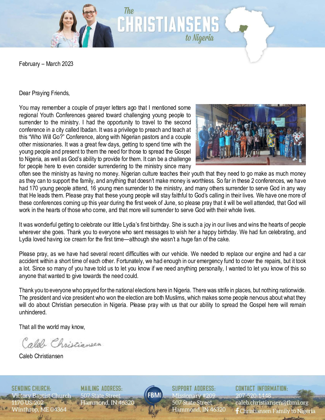 View Larger Image Caleb Christiansen Feb-Mar 2023 Prayer Letter Proofreader2023-04-20T20:26:28-05:00April 20th, 2023| Share with others. FacebookXLinkedInEmail