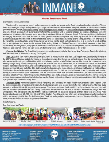 View Larger Image Chad Inman Sep-Oct 2023 Prayer Letter Proofreader2023-11-01T12:33:34-05:00November 1st, 2023| Share with others. FacebookXLinkedInEmail