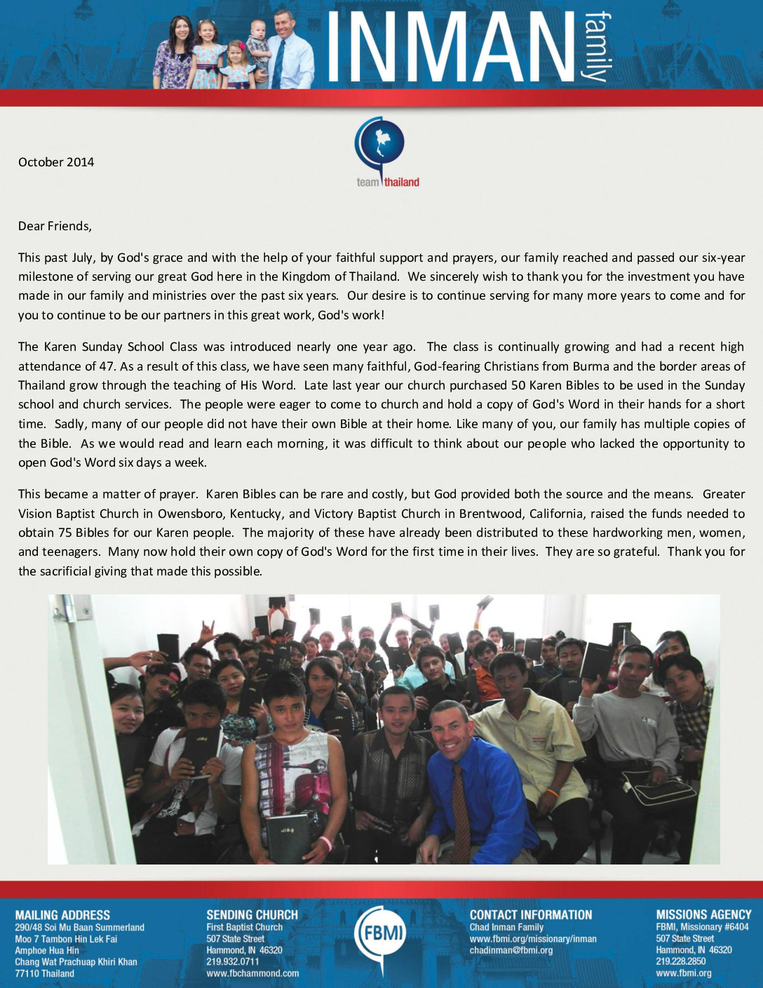 View Larger Image Chad Inman October 2014 Prayer Letter Proofreader2014-10-08T14:52:46-05:00October 8th, 2014| Share with others. FacebookXLinkedInEmail