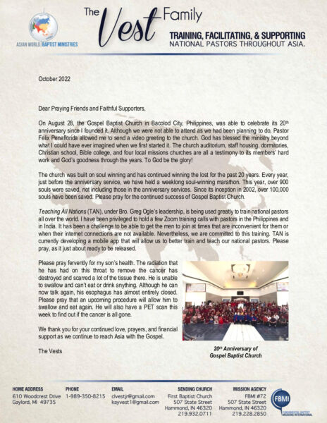 View Larger Image Charlie Vest October 2022 Prayer Letter Proofreader2022-10-03T14:33:51-05:00October 3rd, 2022| Share with others. FacebookXLinkedInEmail