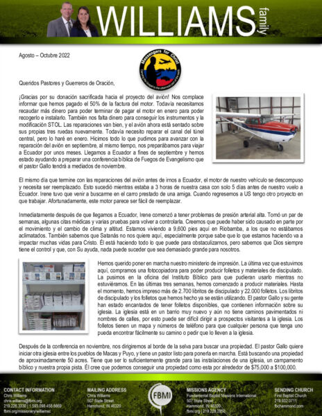 View Larger Image Chris Williams Aug-Oct 2022 SPANISH Prayer Letter – Revised Proofreader2022-11-08T11:59:21-06:00November 8th, 2022| Share with others. FacebookXLinkedInEmail