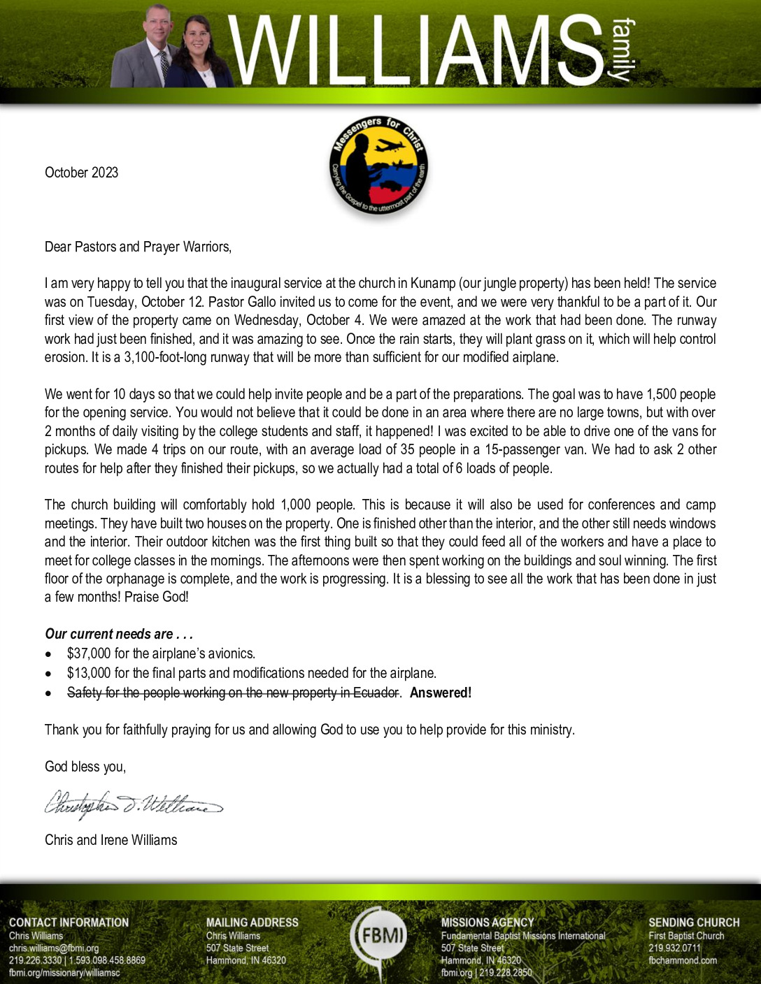 View Larger Image Chris Williams October 2023 ENGLISH Prayer Letter Proofreader2023-10-31T19:28:15-05:00October 31st, 2023| Share with others. FacebookXLinkedInEmail