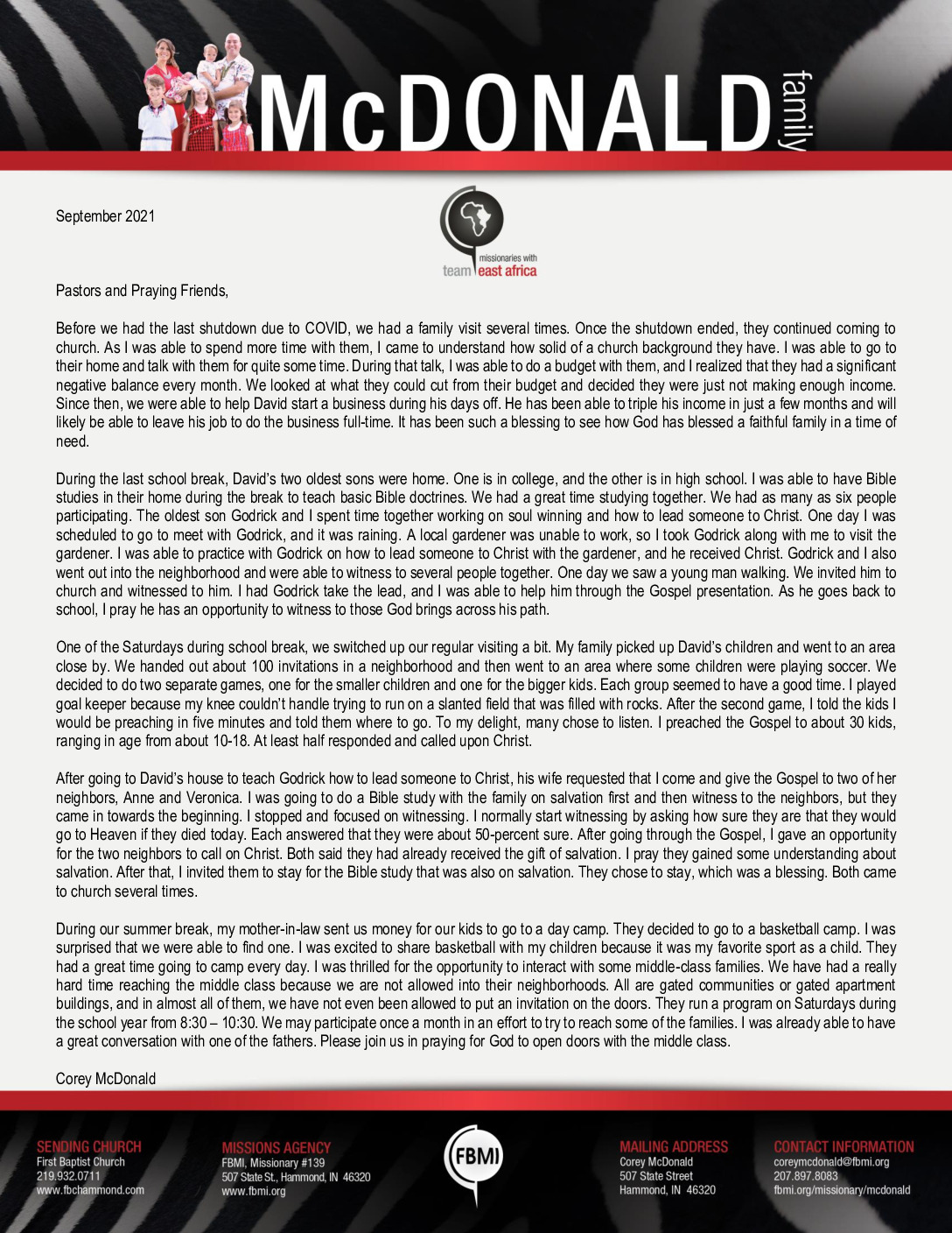 View Larger Image Corey McDonald September 2021 Prayer Letter Proofreader2021-10-06T21:34:03-05:00October 6th, 2021| Share with others. FacebookXLinkedInEmail