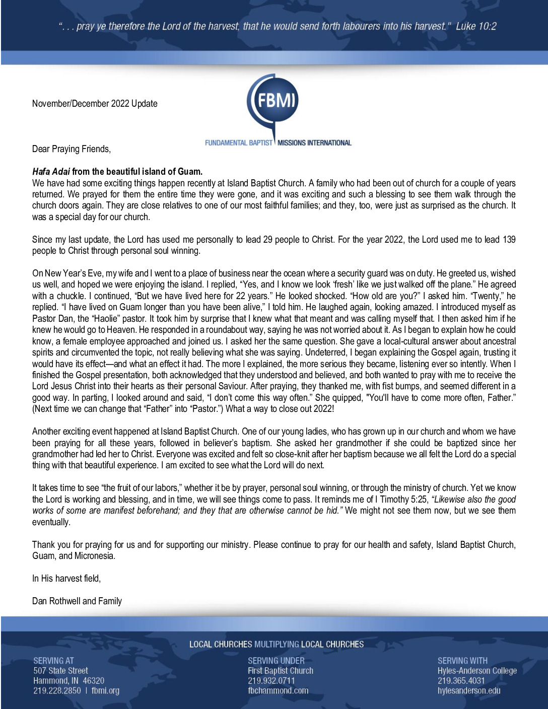 View Larger Image Dan Rothwell Nov-Dec 2022 Prayer Letter Proofreader2023-01-19T20:00:46-06:00January 19th, 2023| Share with others. FacebookXLinkedInEmail