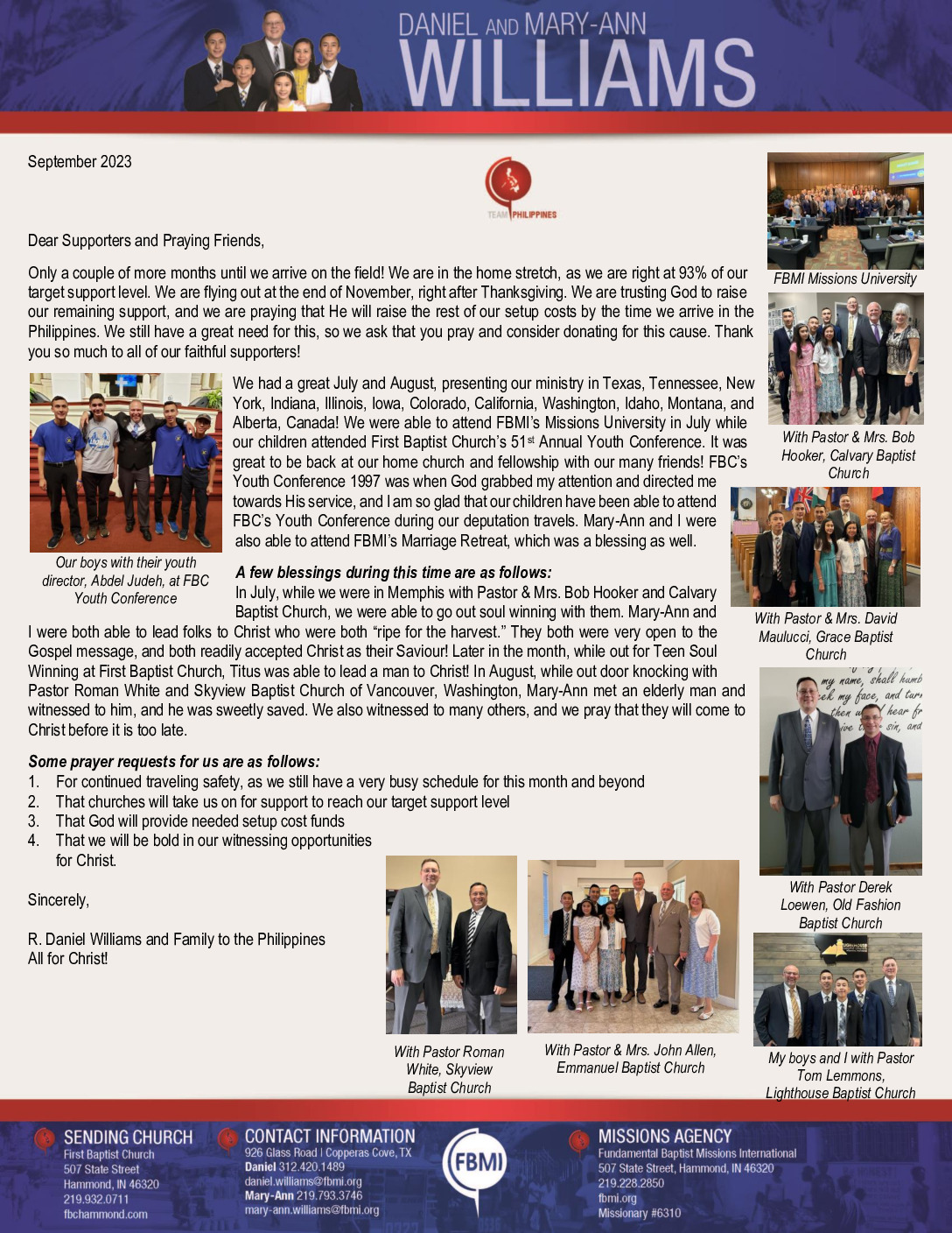 View Larger Image Daniel Williams September 2023 Prayer Letter – Amended Proofreader2023-09-19T14:17:24-05:00September 19th, 2023| Share with others. FacebookXLinkedInEmail
