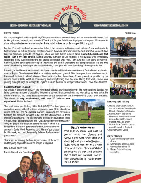 View Larger Image Daniel Solt August 2023 Prayer Letter – Revision Proofreader2023-08-08T09:28:26-05:00August 8th, 2023| Share with others. FacebookXLinkedInEmail