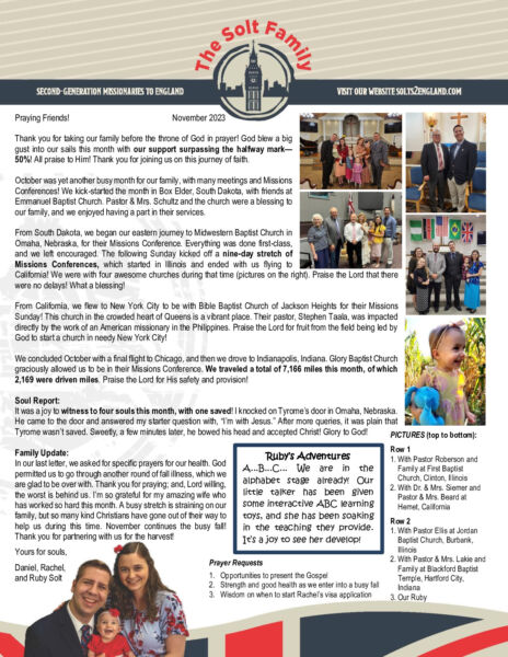 View Larger Image Daniel Solt November 2023 Prayer Letter – Revision Proofreader2023-11-08T17:30:40-06:00November 8th, 2023| Share with others. FacebookXLinkedInEmail