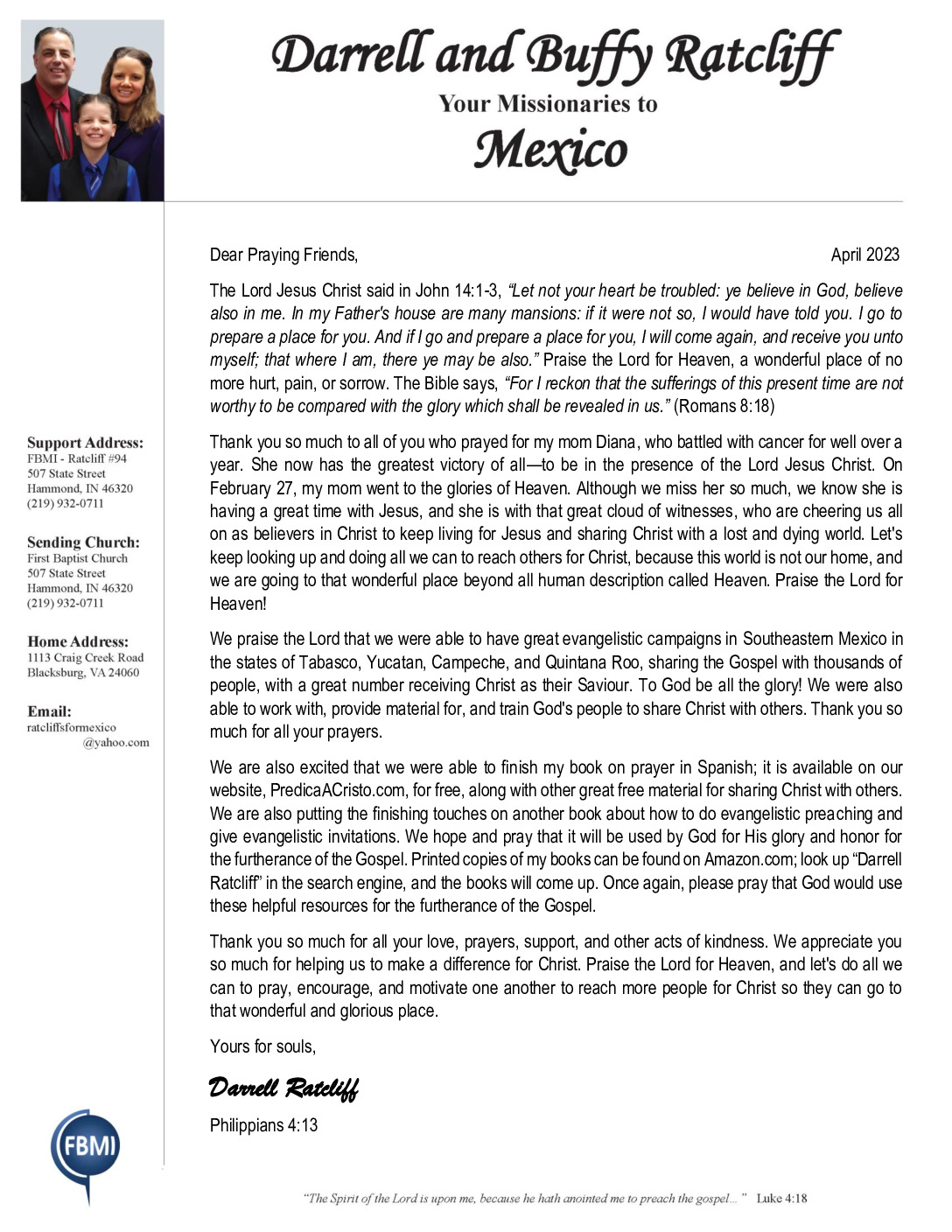 View Larger Image Darrell Ratcliff April 2023 Prayer Letter Proofreader2023-03-31T15:35:42-05:00March 31st, 2023| Share with others. FacebookXLinkedInEmail
