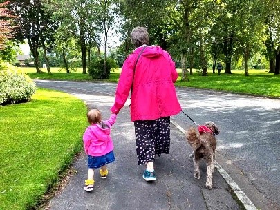 - Grandma and Ruby take the dog for a walk.