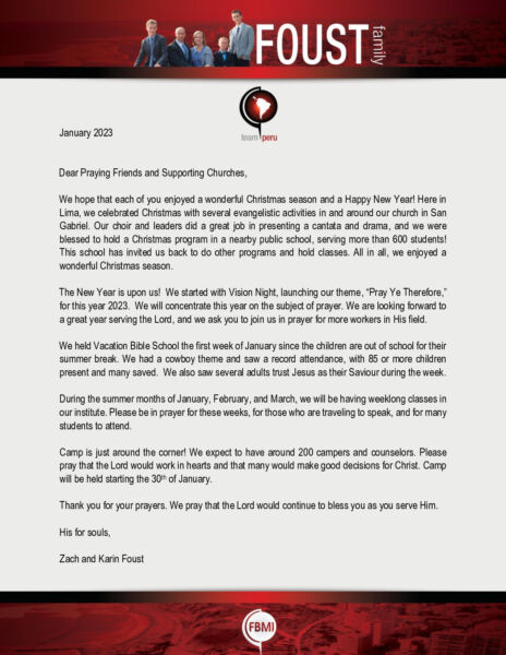 View Larger Image Zach Foust Sr. January 2023 Prayer Letter Proofreader2023-01-09T14:27:04-06:00January 9th, 2023| Share with others. FacebookXLinkedInEmail