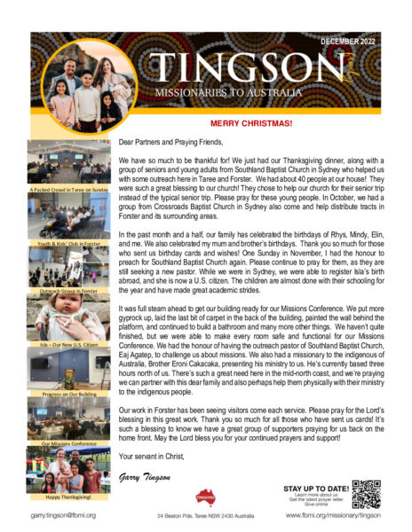 View Larger Image Garry Tingson December 2022 Prayer Letter Proofreader2022-11-30T17:08:40-06:00November 30th, 2022| Share with others. FacebookXLinkedInEmail