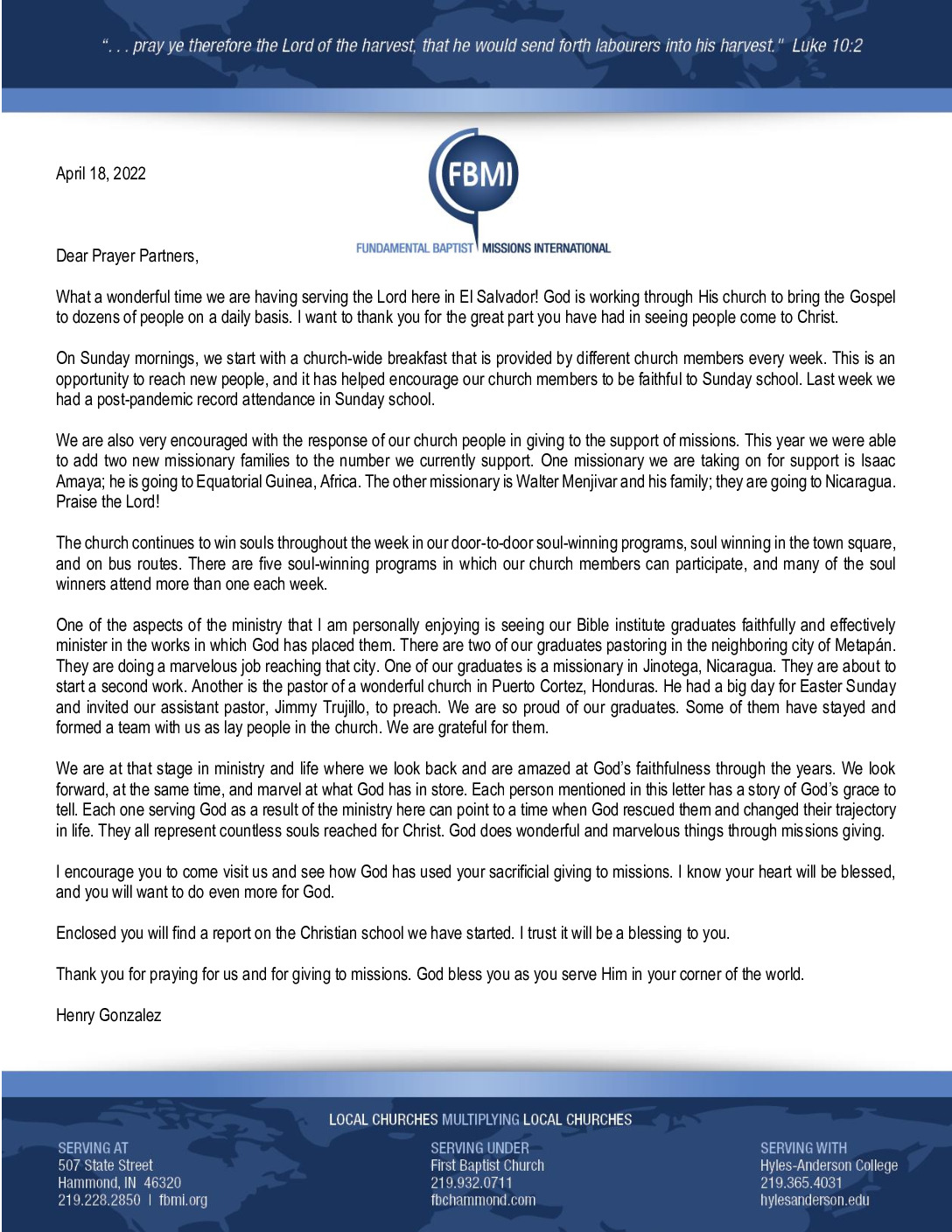 View Larger Image Henry Gonzalez April 2022 Prayer Letter Proofreader2022-04-18T16:04:41-05:00April 18th, 2022| Share with others. FacebookXLinkedInEmail