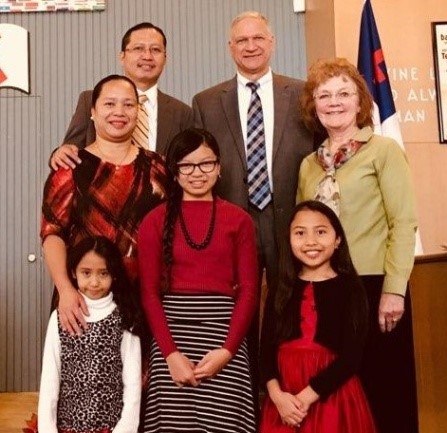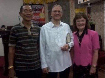 We had a wonderful three days together, as he and his wife related their wonderful journey to Linda and me. I received an added blessing when I found out that not only did Ryan get saved during that revival, but his brother and father also got saved the same night. Then he shared with me that his mother had been saved 10 years before and had been praying for those 10 years that her family would get saved. Her prayers were answered that November 5, 2003, during that revival meeting. I believe I am going to shout! Ryan then showed me a picture (on the right) that was taken the last time I was in the Philippines. It was of Linda and me standing next to his father. At the time of the picture, I had no idea who this man was or the story of his whole family. What a time of rejoicing we had in Delano, California!