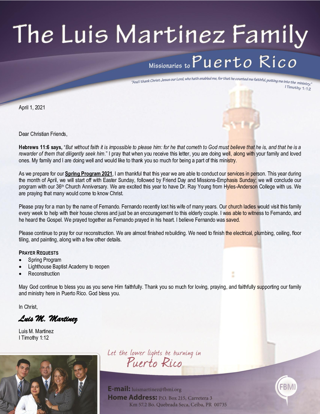 View Larger Image Luis Martinez April 2021 Prayer Letter Proofreader2021-04-06T18:32:58-05:00April 6th, 2021| Share with others. FacebookXLinkedInEmail