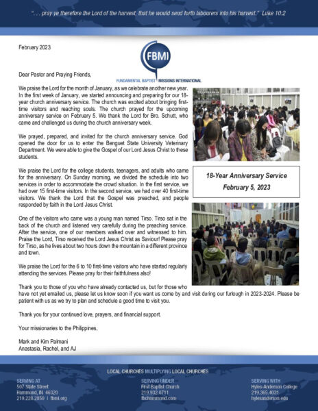View Larger Image Mark Palmani February 2023 Prayer Letter Proofreader2023-03-09T21:43:47-06:00March 9th, 2023| Share with others. FacebookXLinkedInEmail