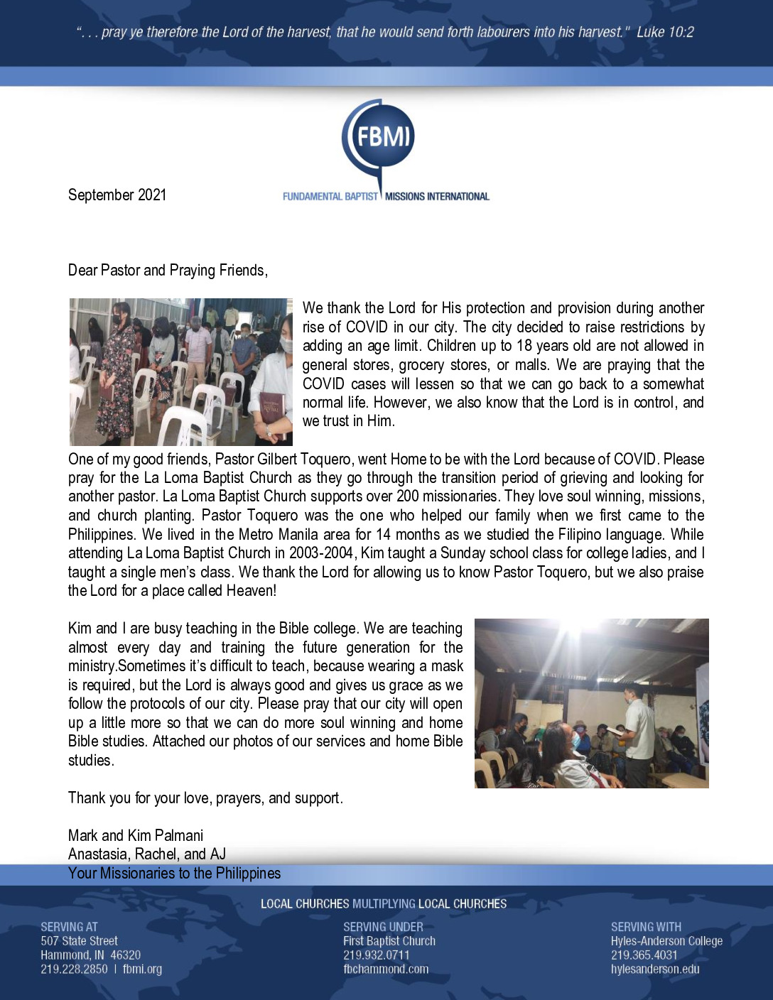 View Larger Image Mark Palmani September 2021 Prayer Letter Proofreader2021-10-22T15:15:56-05:00October 22nd, 2021| Share with others. FacebookXLinkedInEmail