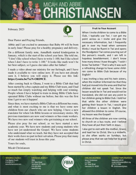 View Larger Image Micah Christiansen February 2023 Prayer Letter Proofreader2023-02-12T12:34:24-06:00February 12th, 2023| Share with others. FacebookXLinkedInEmail