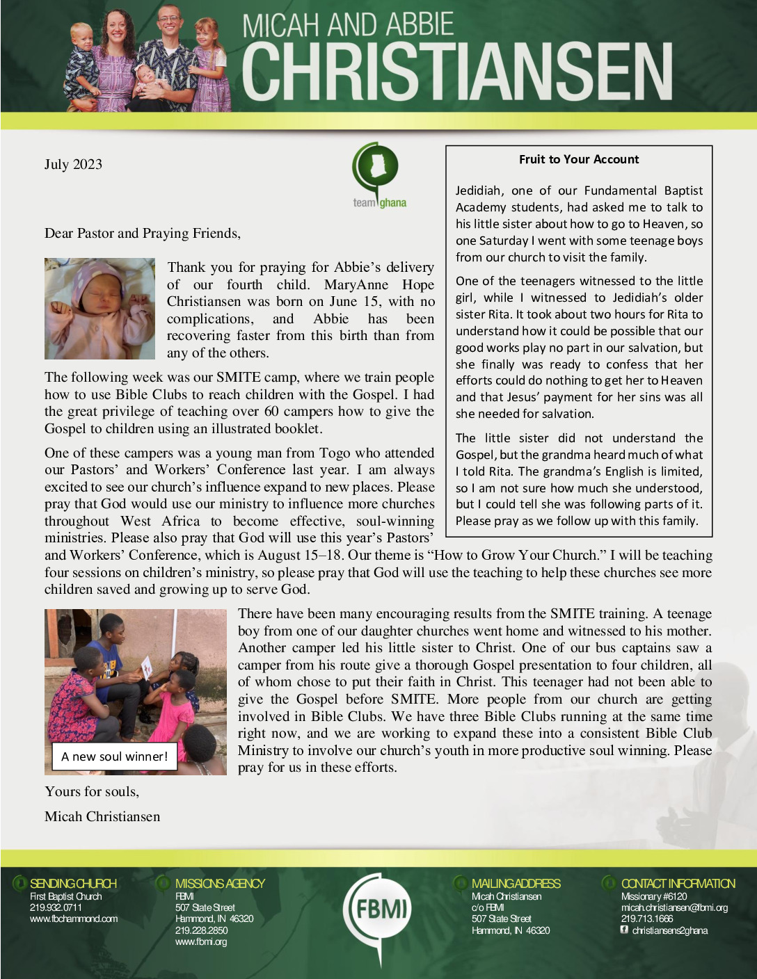 View Larger Image Micah Christiansen July 2023 Prayer Letter – Revised Proofreader2023-08-06T13:14:06-05:00August 6th, 2023| Share with others. FacebookXLinkedInEmail