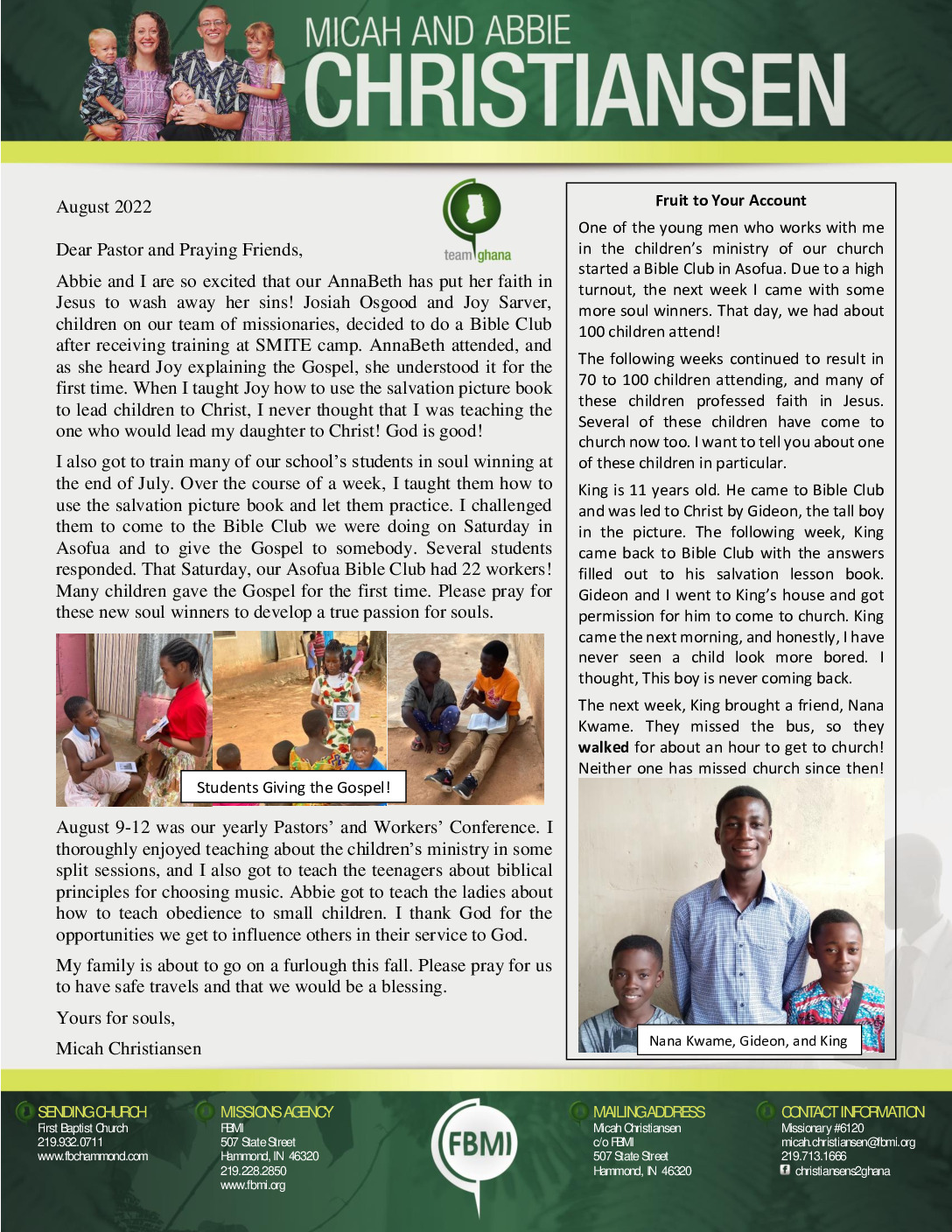 View Larger Image Micah Christiansen August 2022 Prayer Letter Proofreader2022-08-29T18:19:19-05:00August 29th, 2022| Share with others. FacebookXLinkedInEmail