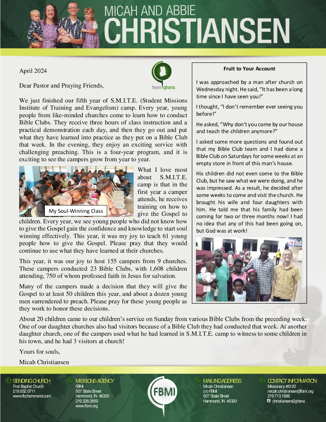 View Larger Image Micah Christiansen April 2024 Prayer Letter Proofreader2024-04-24T17:11:25-05:00April 24th, 2024| Share with others. FacebookXLinkedInEmail