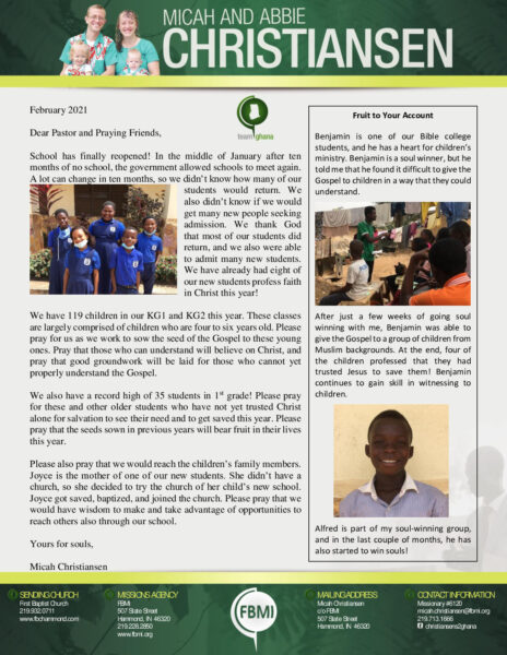 View Larger Image Micah Christiansen February 2021 Prayer Letter Proofreader2021-03-17T21:52:35-05:00March 17th, 2021| Share with others. FacebookXLinkedInEmail
