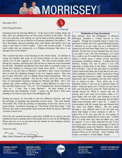 View Larger Image Morrissey December 2014 prayer letter FBMI2014-12-04T12:09:49-06:00December 4th, 2014| Share with others. FacebookXLinkedInEmail
