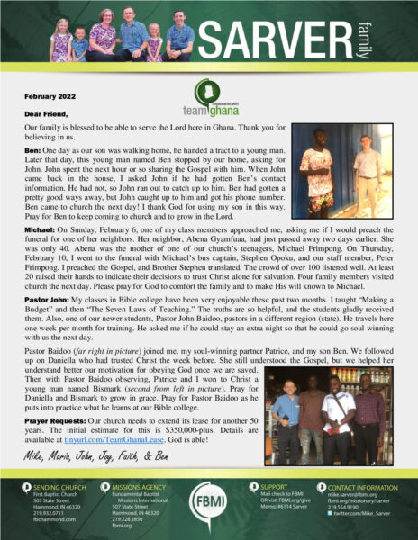 View Larger Image Mike Sarver February 2022 Prayer Letter Proofreader2022-03-01T20:17:26-06:00March 1st, 2022| Share with others. FacebookXLinkedInEmail