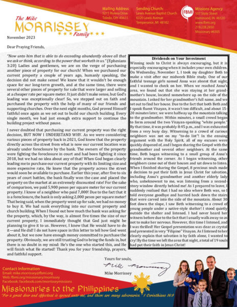 View Larger Image Mike Morrissey November 2023 Prayer Letter Proofreader2023-11-17T04:51:16-06:00November 17th, 2023| Share with others. FacebookXLinkedInEmail