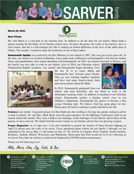 View Larger Image Mike Sarver March 2021 Prayer Letter Proofreader2021-03-25T15:53:16-05:00March 25th, 2021| Share with others. FacebookXLinkedInEmail