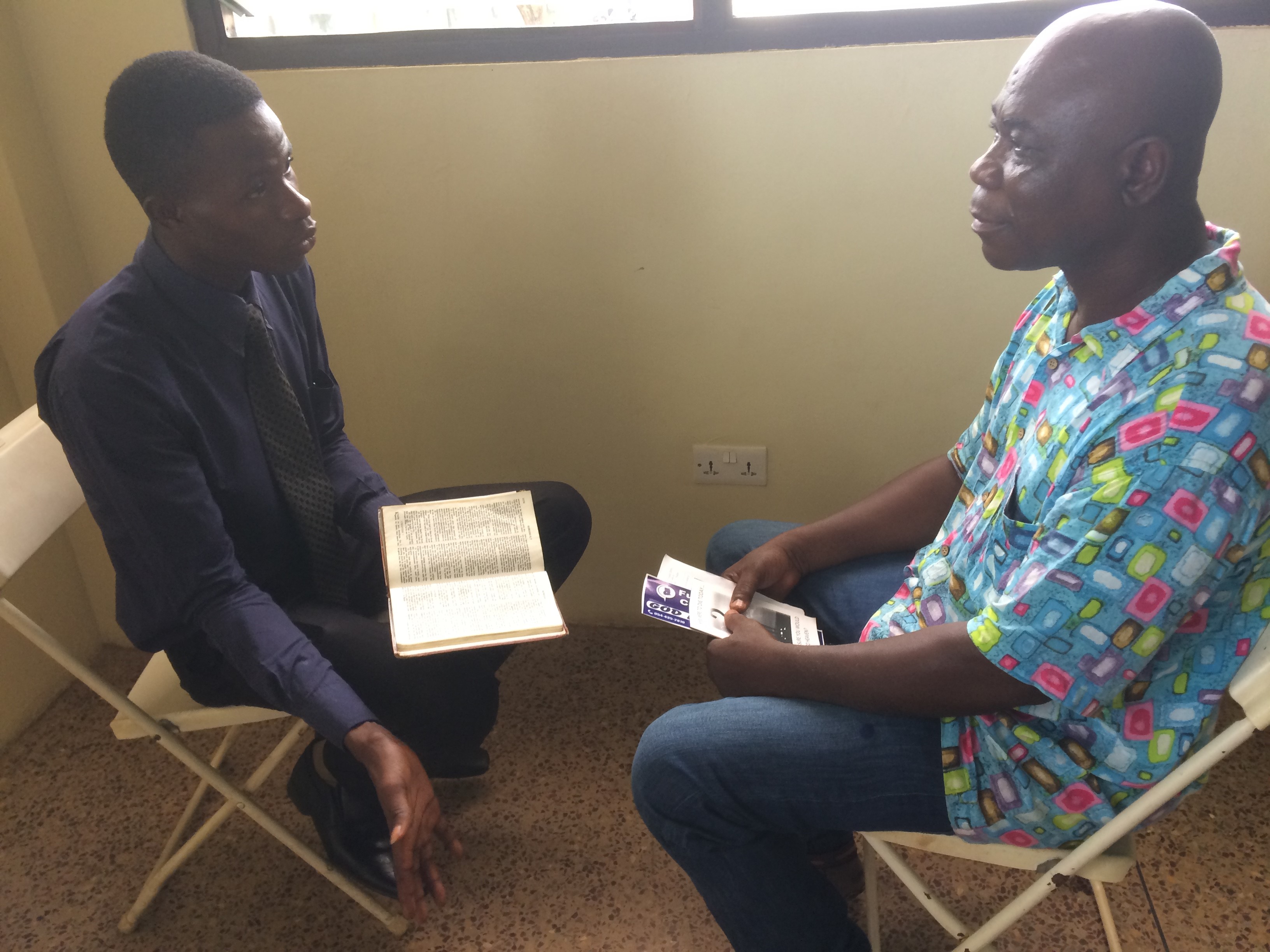 After Dennis’ accident last year, my son John and I started visiting in Dennis’ neighborhood. This past Sunday, we had three visitors from his Dennis’ area. His wife Safia brought a visitor, and two men whom John and I had invited came. All three heard the Gospel and professed their faith in Christ. (At the end of this post: Our Bible college student Michael preaching the Gospel to our visitor, Akwasi Addai.)