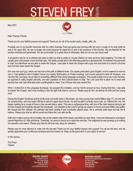 View Larger Image Steven Frey May 2023 Prayer Letter Proofreader2023-04-28T18:38:30-05:00April 28th, 2023| Share with others. FacebookXLinkedInEmail