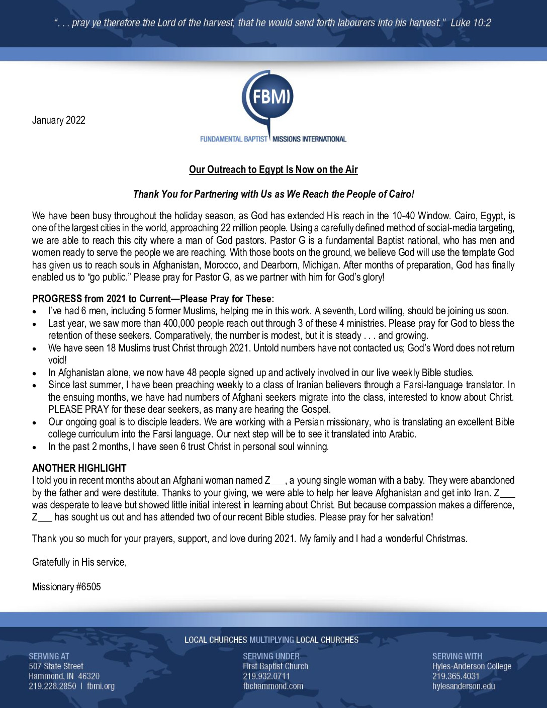 Fundamental Baptist Missions International is a local-church missions agency that trains, supports, finances, and develops missionaries and ministries which preach the Gospel of Jesus Christ, disciple believers, and multiply churches. It is our vision to see Gospel-preaching churches actively multiplying in every nation.