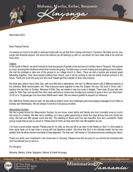 View Larger Image Mshama Kinyonga Mar-Apr 2023 Prayer Letter Proofreader2023-04-19T09:26:22-05:00April 19th, 2023| Share with others. FacebookXLinkedInEmail